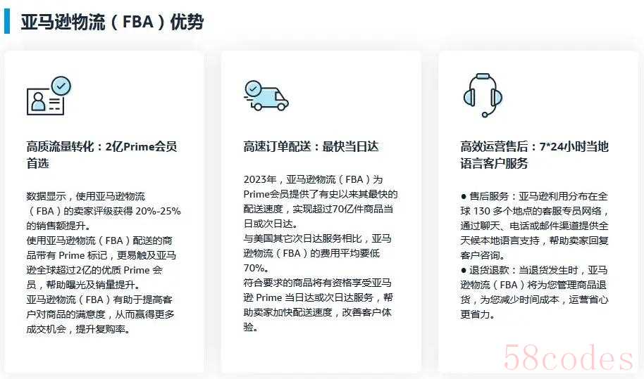 卖家将商品批量发送至亚马逊运营中心之后,由亚马逊负责帮助卖家存储商品;当商品售出后,由亚马逊完成订单分拣、包装和配送,并为这些商品提供买家咨询、退货等客户服务,帮助卖家节省人力、物力和财力。