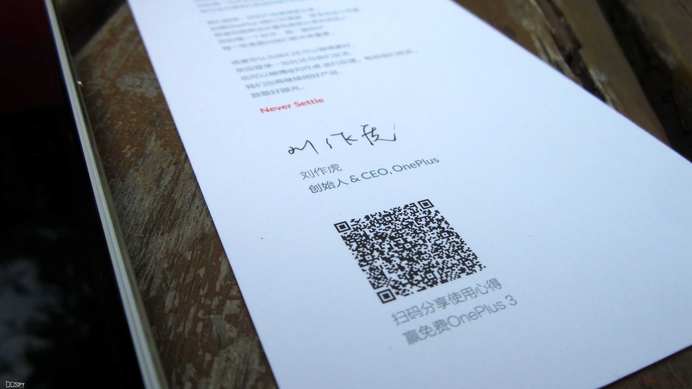 打开盒子,一加手机3静静的被拥护在一簇火红当中。取出手机,下面是各种配件:说明书、保修卡、充电头和数据线以及一加科技创始人兼CEO刘作虎的签名和安装SIM卡时要用到的漂亮的笑脸卡针。