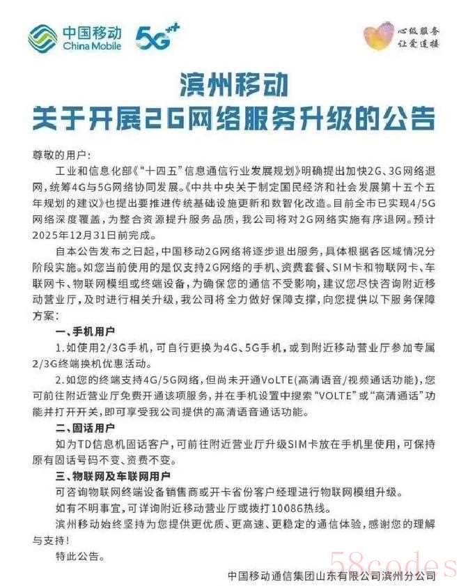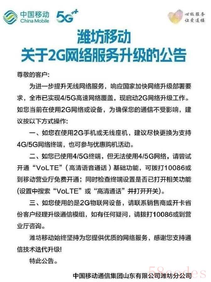 中国三大电信运营商之一的中国移动(包括其在山东的分公司山东移动)已经宣布,"计划于2023年12月31日停止全国范围内的2G网络服务"。