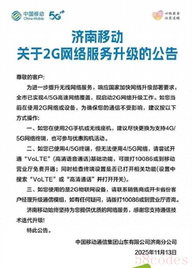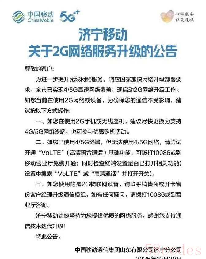 从后往前看问题的来龙去脉。先说最近的事情:上个月,山东各地市的移动公司陆续发布了2G退网的公告。这次退网不是某一天闪电关网,而是有阶段、有区域地逐步停掉2G服务,给用户时间适应。公告发出去后,社区里老人家开始慌了,有人电话打不通,有人手机突然没信号。这就是退网暴露的问题——很多人对自己手机和卡的型号、服务细节并不了解。