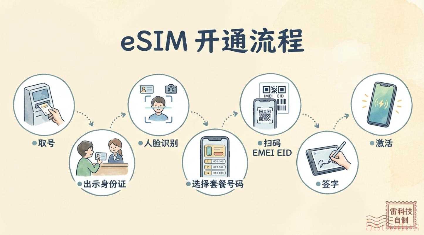 刨开工作人员专业性、熟练度、服务态度这些人为因素,三家的eSIM开通流程几乎一模一样,基本都是“七步走”: