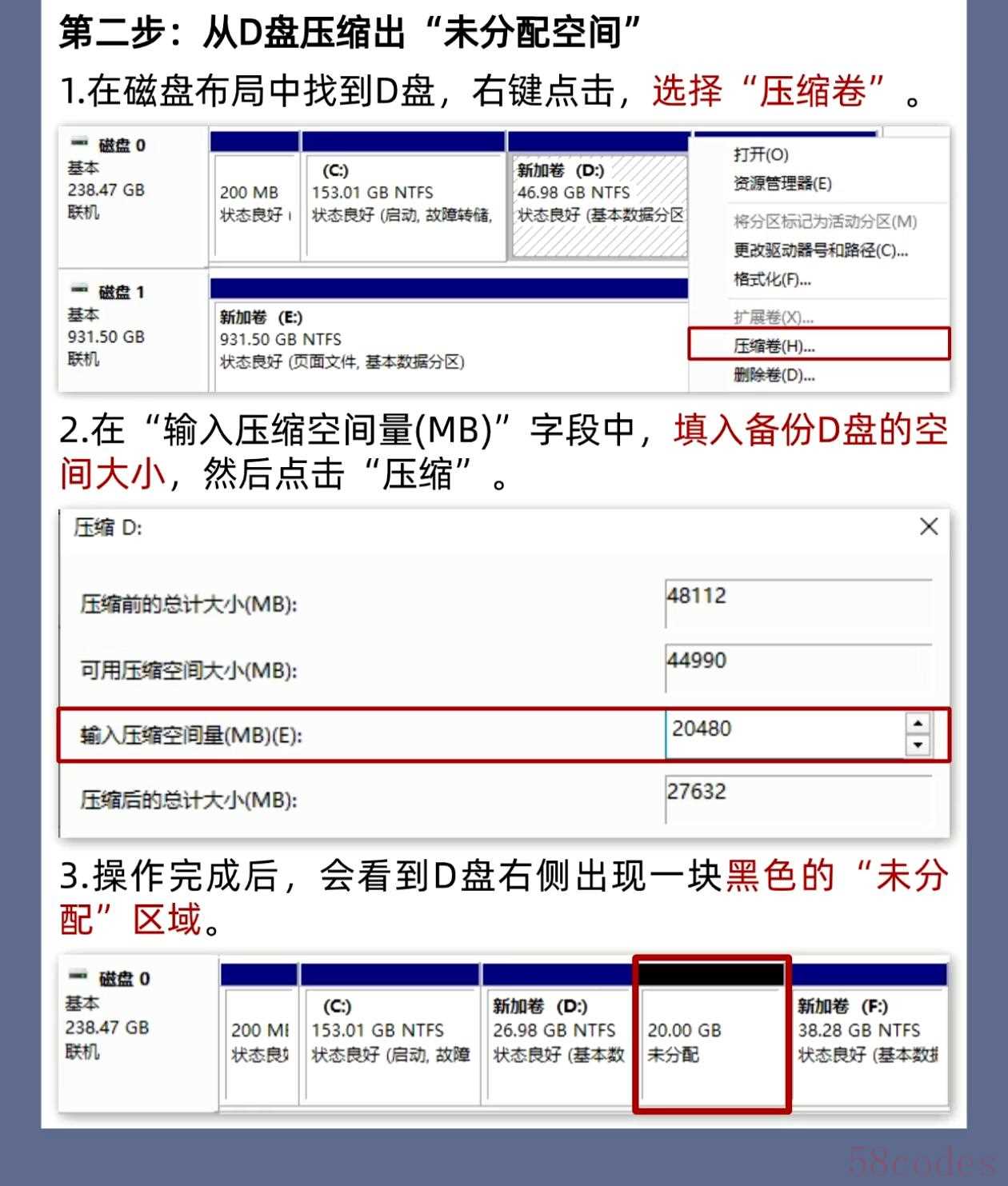 - 压缩完成后,会在C盘和D盘之间出现一个未分配的空间。