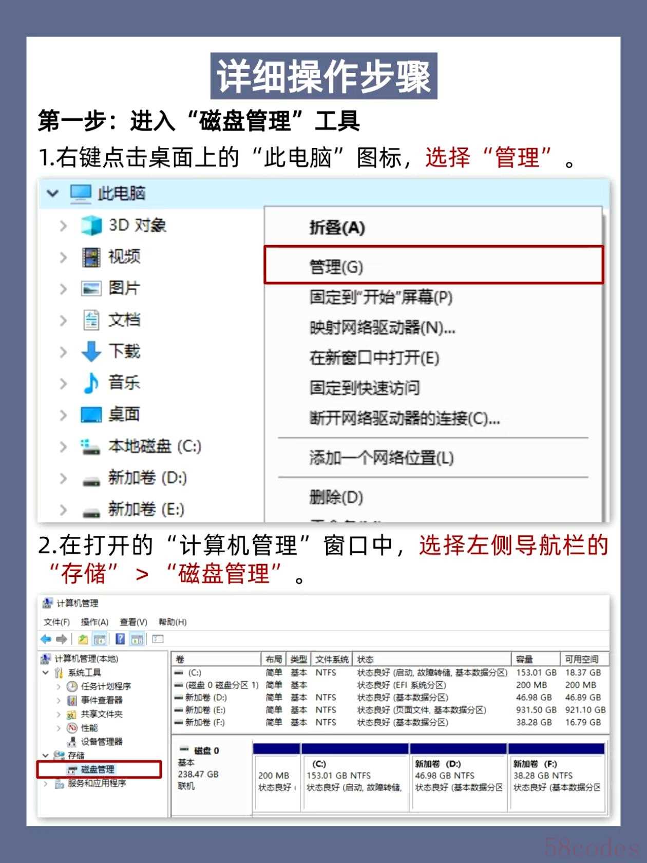 右键“此电脑”→点击“管理”→左侧找到“存储”→点开“磁盘管理”。这里能看到电脑所有磁盘的分区情况,C盘是系统盘,D盘是我们要“借空间”的盘。