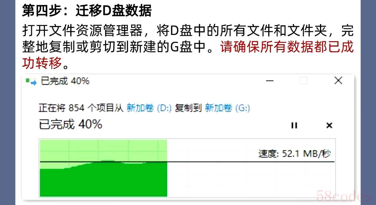 这一步是为了临时存放D盘的数据,相当于给D盘“搬家”腾地方。