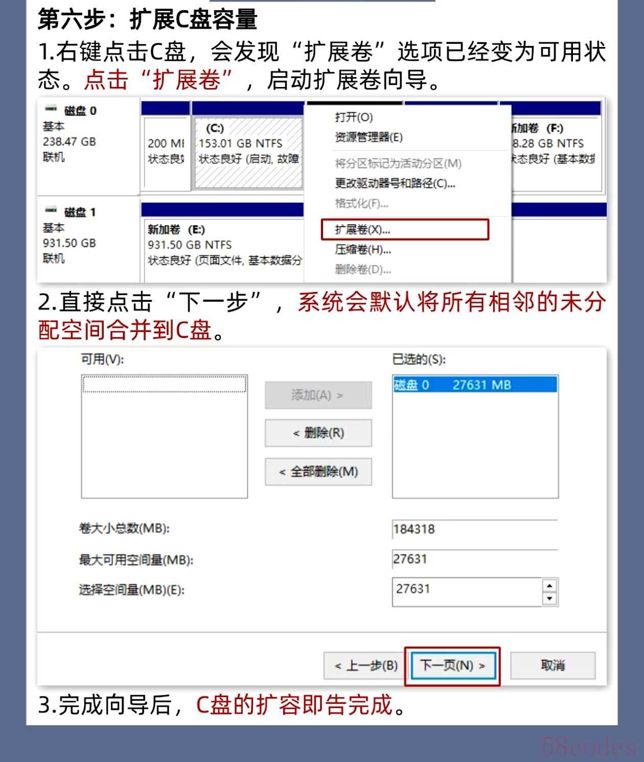 右键C盘→选择“扩展卷”→按向导点击“下一步”,系统会自动选中所有未分配空间→继续“下一步”完成合并。