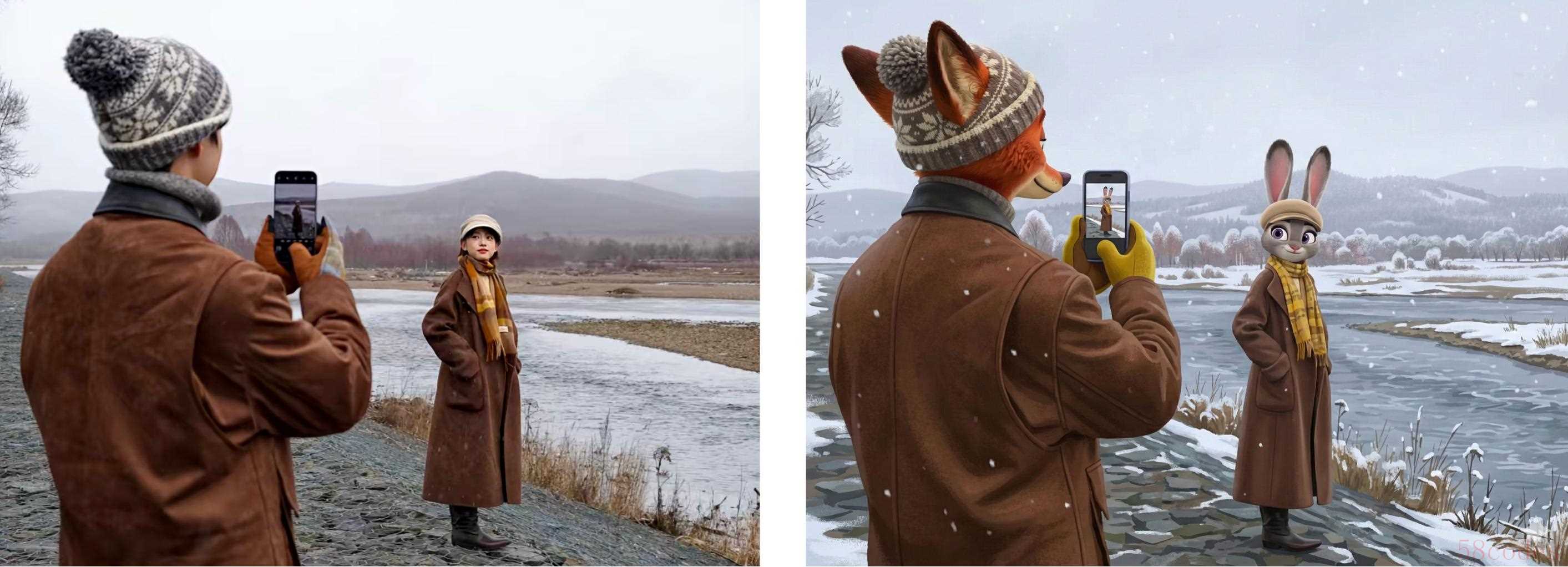 同样的提示词,我们还把爱范儿在大兴安岭拍摄的样片,也进行一次风格转换。Nano Banana Pro 把大兴安岭的冷,描绘地更加极致,雪花飘在了衣服上。