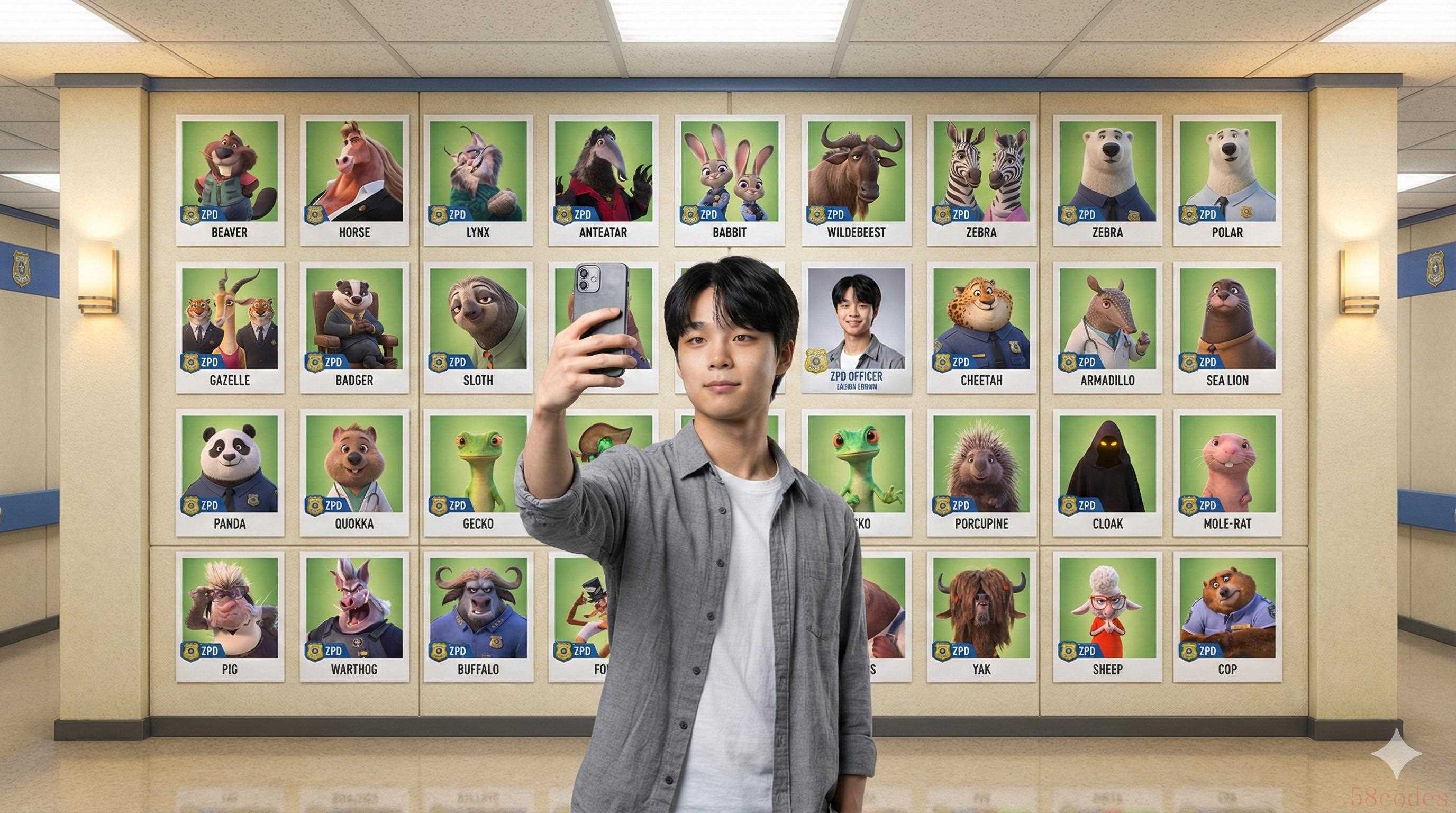 最终目标: 结果应展现出仿佛该用户已加入了ZPD,在官方员工照片墙前,与28位《疯狂动物城》的角色及其个人ID肖像一起合影留念之效果;画面需高清晰度,4K质量,有电影感但具备现实主义氛围感。