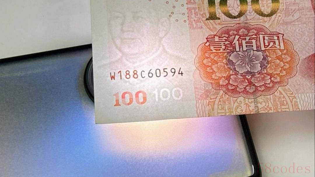 拿到钞票先不要着急把它收起来,我们把钱币正面上下两个半圆的彩色图案,向后对折,这样就能拼出一个完整的凤凰鸟,真钞的线条会严丝合缝,连羽毛纹路都是连贯的,假钞这里就会露出马脚,要么线条错位,要么图案根本对不上。
