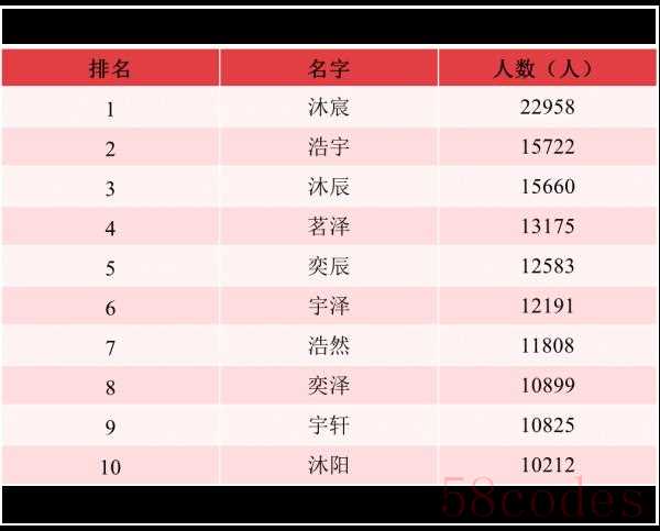 2021年出生并已经进行户籍登记的男性新生儿中,使用频率最高的10个名字依次为:沐宸、浩宇、沐辰、茗泽、奕辰、宇泽、浩然、奕泽、宇轩、沐阳。与2020年相比,除浩宇、奕辰、宇轩外,其余名字首次进入前十,其中“沐宸”使用人数达到2.3万,登顶榜首,成为男性新生儿名字首选。