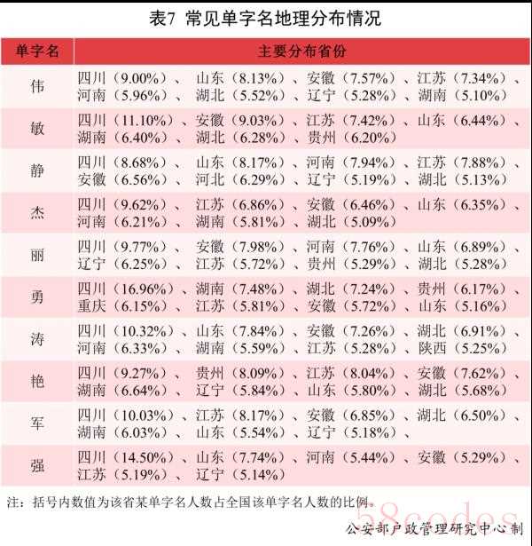 通过对常见名字的地理分布进行统计分析,我们发现名字也具有特定的地域分布特征。全国户籍人口中,除姓氏外,单字名占13.97%,双字名占84.55%,其他字数名字占1.48%。