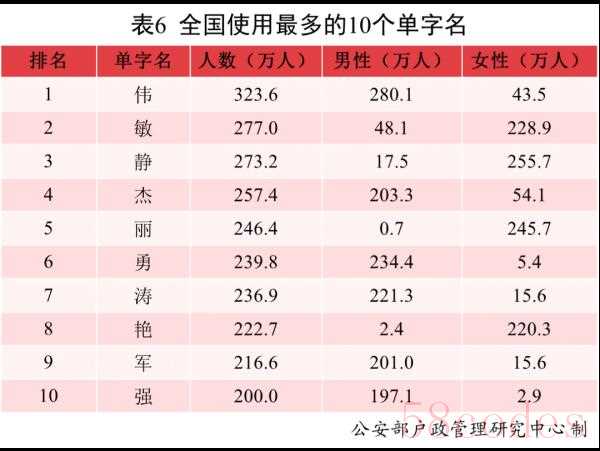 全国户籍人口中,使用频率最高的10个单字名依次为:伟、敏、静、杰、丽、勇、涛、艳、军、强。其中“伟”名列榜首,使用人数为323.6万。男性使用较多的单字名为伟、杰、勇、涛、军、强;女性使用较多的单字名为敏、静、丽、艳。