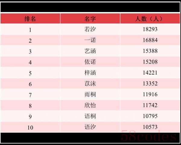 2021年出生并已经进行户籍登记的女性新生儿中,使用频率最高的10个名字依次为:若汐、一诺、艺涵、依诺、梓涵、苡沫、雨桐、欣怡、语桐、语汐。与2020年相比,若汐、艺涵、苡沫首次进入前十,其中“若汐”使用人数达到1.8万,登顶榜首,成为女性新生儿名字首选。