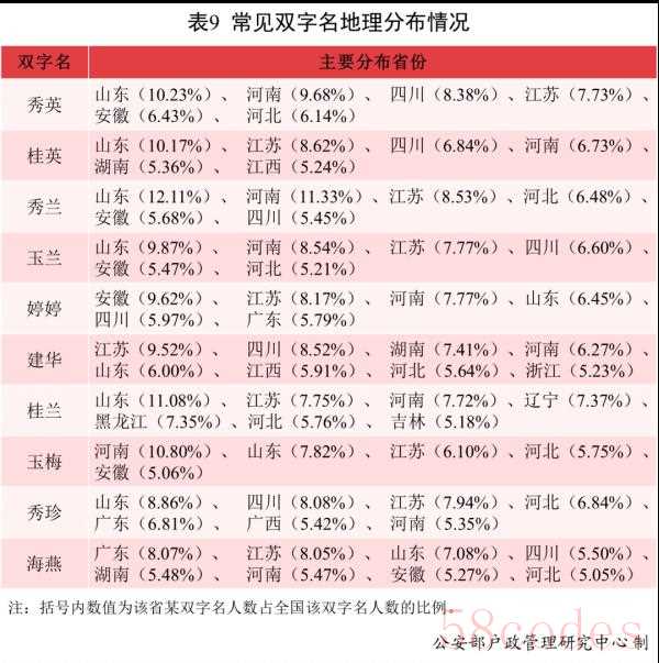 全国使用最多的10个双字名相对集中分布在山东、河南、四川、江苏、河北、湖南、安徽等省份。此外,还有5.24%的“桂英”分布在江西;5.79%的“婷婷”、6.81%的“秀珍”、8.07%的“海燕”分布在广东;5.91%、5.23%的“建华”分布在江西和浙江;7.37%、7.35%、5.18%的“桂兰”分布在辽宁、黑龙江和吉林;5.42%的“秀珍”分布在广西。