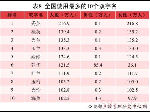 全国户籍人口中,使用频率最高的10个双字名依次为:秀英、桂英、秀兰、玉兰、婷婷、建华、桂兰、玉梅、秀珍、海燕。其中“秀英”名列榜首,使用人数为216.9万。男性使用较多的双字名仅有“建华”;其余常见双字名为女性使用较多,重名率明显高于男性。
