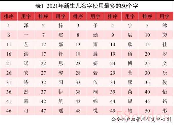 2021年出生并已经进行户籍登记的新生儿名字中,使用频率最高的50个字依次为泽、梓、子、宇、沐等。与2020年相比,汐、芮、霖、航等字受到青睐。