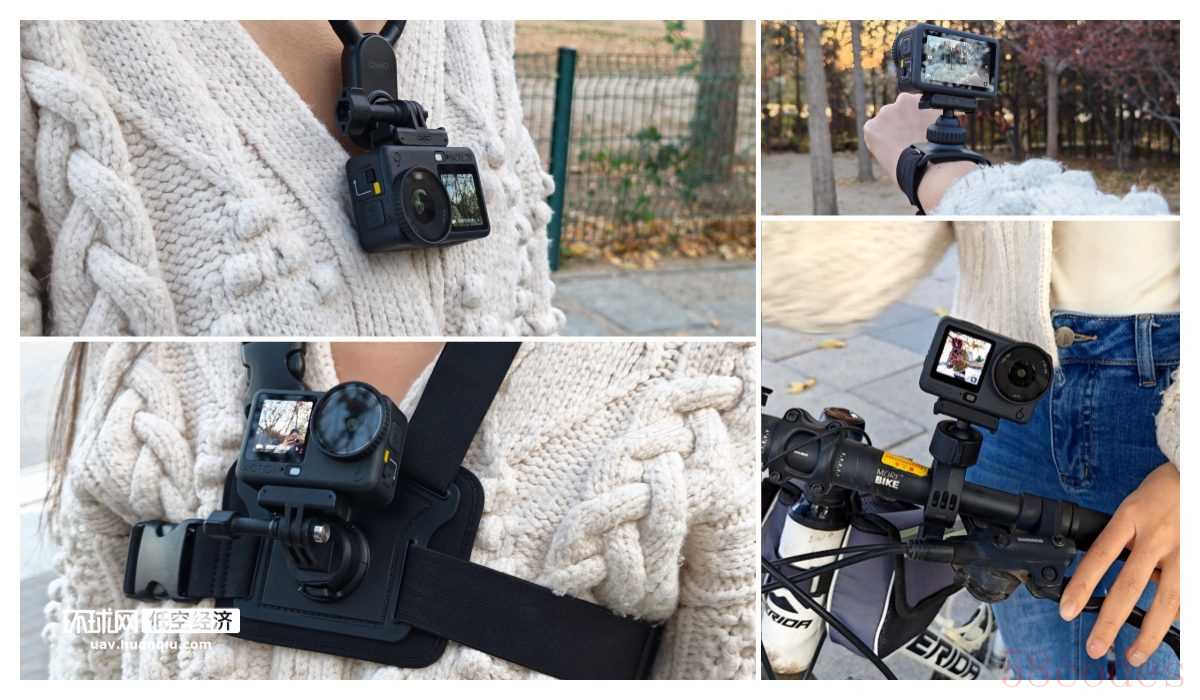 作为运动相机的Osmo Action 6也有很强的扩展性,可以固定到各种位置拍摄。它也延续了磁吸快拆接口,轻松卡到位、固定又牢固,本代接口升级为了双向快拆设计,方便切换成自拍。