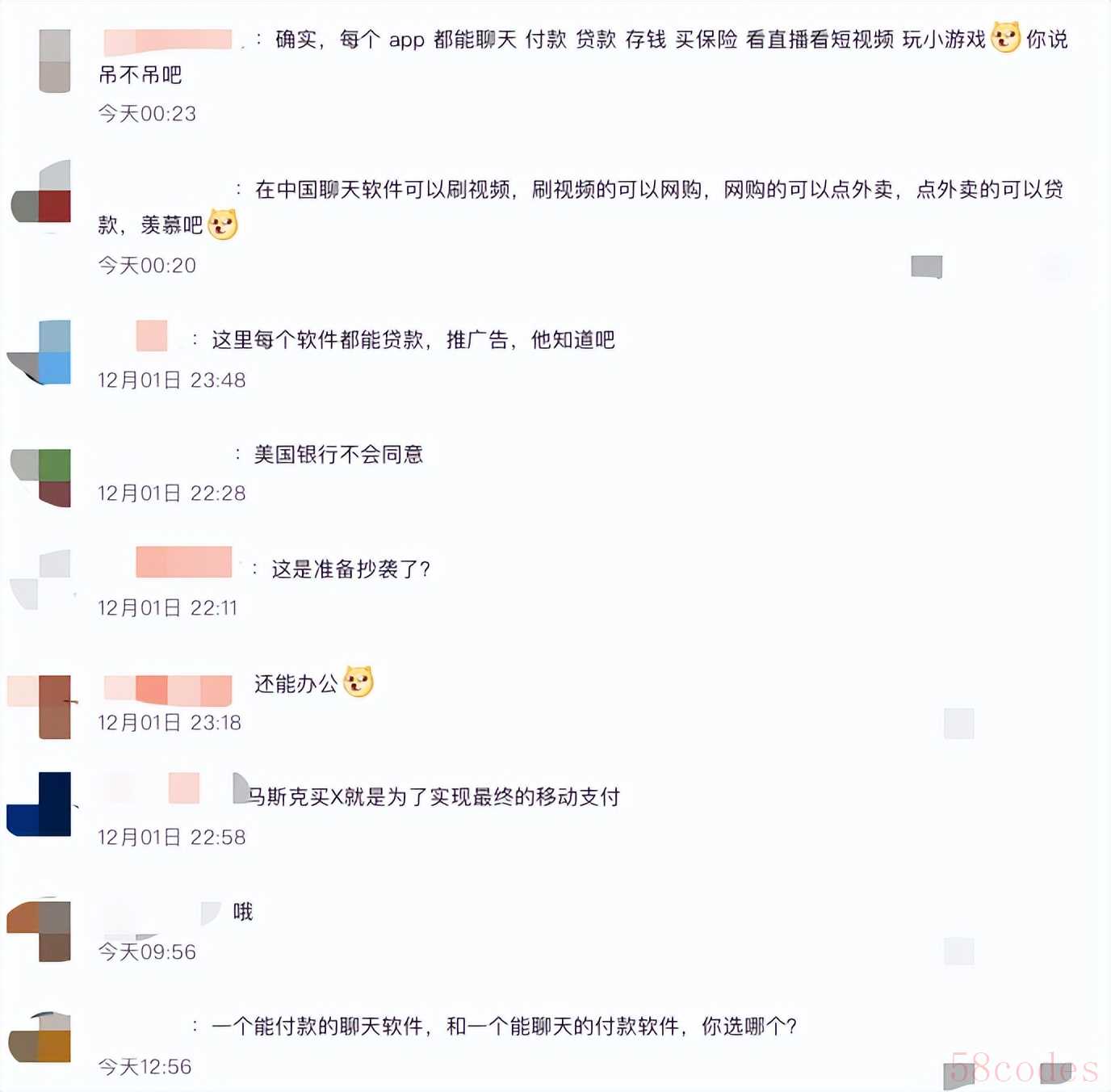面对马斯克这明晃晃的野心,不少网友表示:“ 巨头羡慕的是把人围起来赚钱的模式,并不代表国外用户羡慕这个模式。 ”“ 他只管赚钱就行了,用户难不难用跟他有什么关系。 ”“ 这里每个软件都能贷款,推广告,他知道吧。 ”“ 马斯克买 X 就是为了实现最终的移动支付。 ”“ 一个能付款的聊天软件,和一个能聊天的付款软件,你选哪个? ”“ 在中国聊天软件可以刷视频,刷视频的可以网购,网购的可以点外卖,点外卖的可以贷款,羡慕吧。 ”