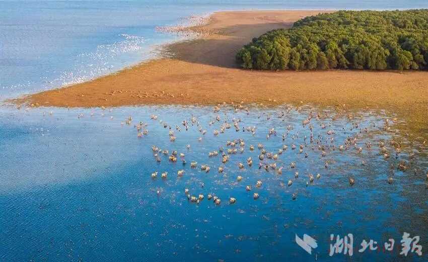11月27日清晨,石首天鹅洲长江故道,麋鹿和雁群和谐共处。(湖北日报全媒记者 柯皓 通讯员 杨涛 摄)