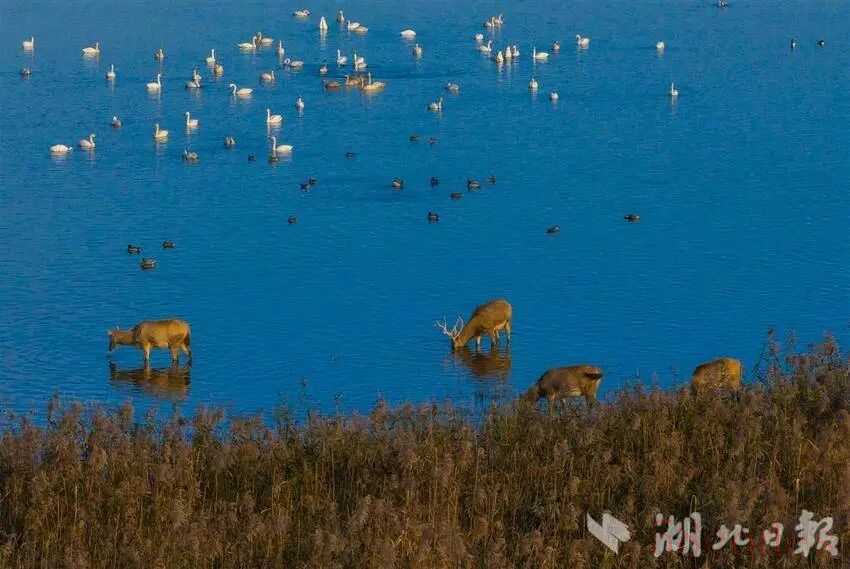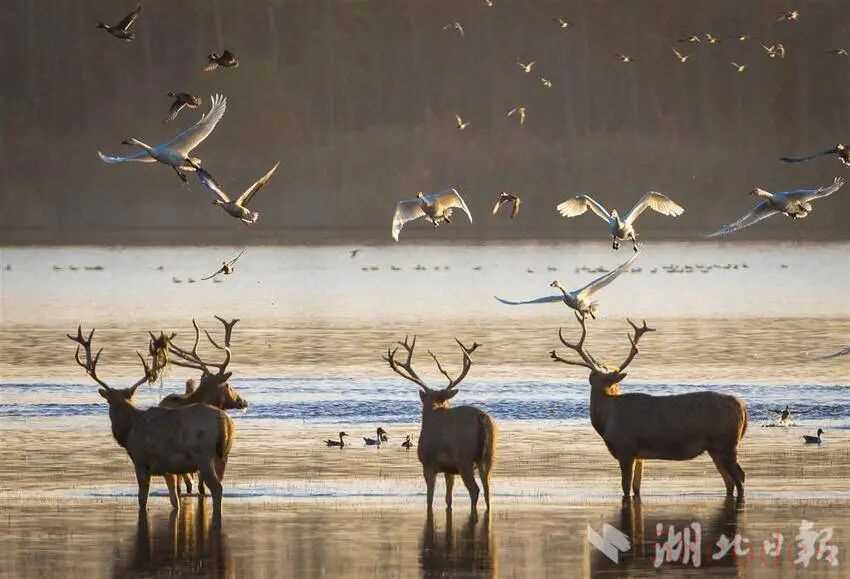 11月26日,石首麋鹿国家级自然保护区,麋鹿和小天鹅共享冬日暖阳。(湖北日报全媒记者 柯皓 通讯员 杨涛 摄)