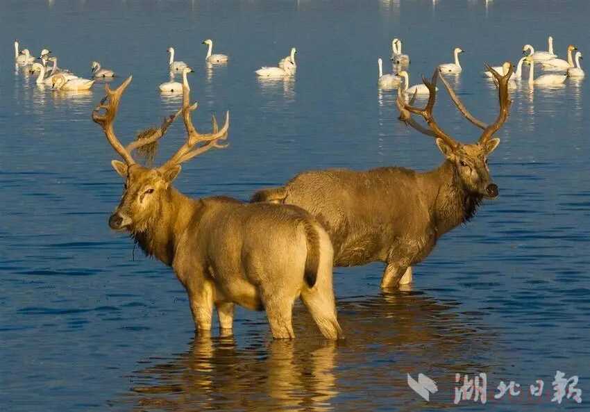 11月26日,两只公麋鹿在天鹅洲故道里休憩,它们背后的水面停满了前来越冬的小天鹅。(湖北日报全媒记者 柯皓 通讯员 杨涛 摄)