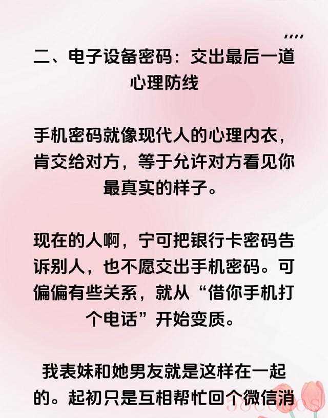 2. "个人空间和隐私":个人空间和隐私是每个人基本的权利,也是维持健康关系的重要因素。当两个人开始过度侵犯对方的个人空间,如未经允许查看手机、私人物品或侵入对方的工作和社交生活,这可能会破坏信任,导致关系越界。尊重对方的个人空间和隐私是维持健康、平衡关系的关键。