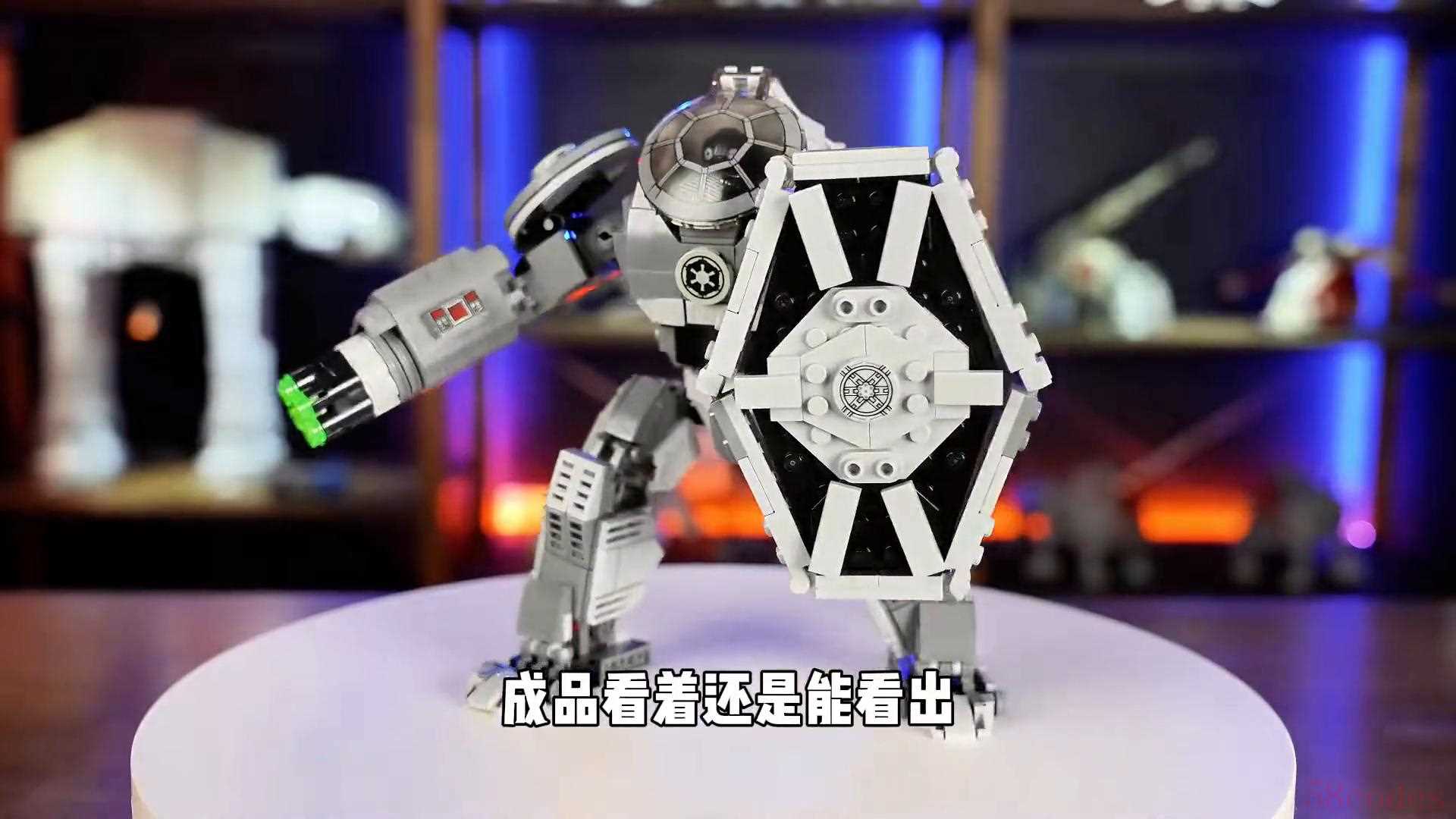 ·TIE战斗机的圆盘零件太大,得重新调整机甲顶部结构,把角度找对,避免出现大缝隙。把机甲的腿加长了一点,显得更高大。给胳膊拼了个爆能炮,把TIE战斗机的机翼缩小,当成机甲的盾牌。