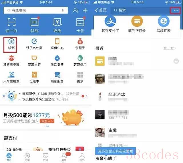 打开支付宝首页,然后点击「转账」,然后点击右上角的「...」更多菜单,如下图所示。