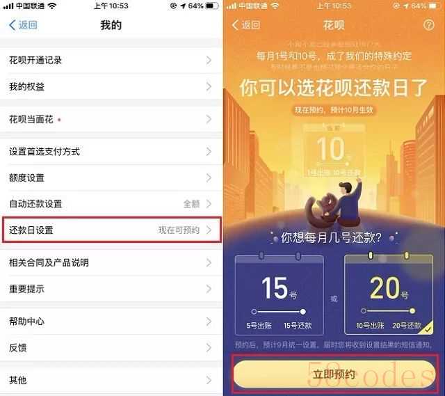 3、花呗还款日可选择设置为每月15 日 或者 20 日;出账日为次月 5 日或者10 日,根据提示完成设置即可。