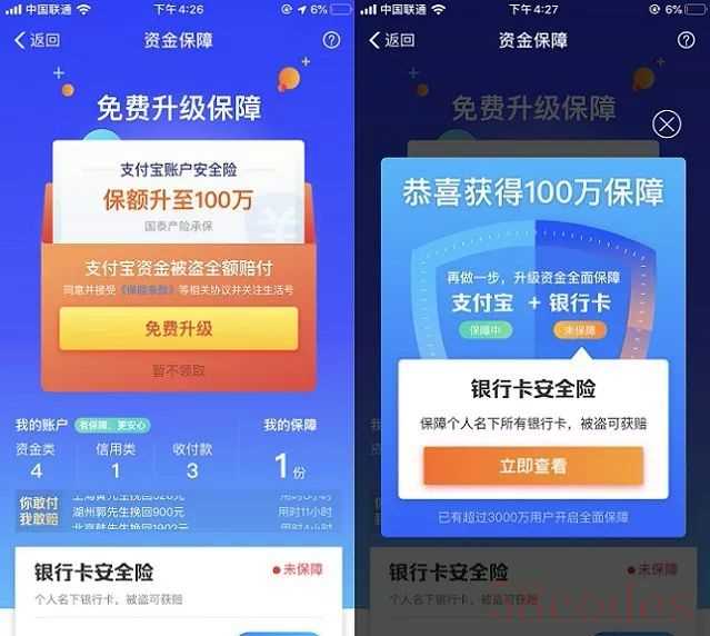 免费申请方法:在支付宝上搜索“账户安全险”根据提示完成升级就可以了。