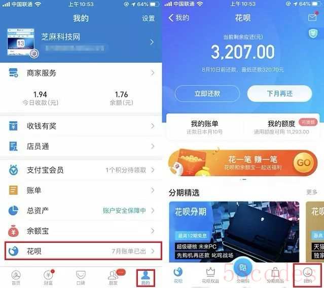 1、首先在手机中打开支付宝APP,然后切换到 「我的」-> 「花呗」,进入蚂蚁花呗之后,再切换到「我的」选项,如下图所示。