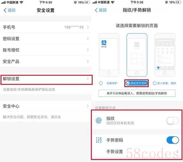 打开支付宝APP,依次点击进入 「我的」->右上角的「设置」->「安全设置」->「解锁设置」,然后选择「启动支付宝时」,下面可以根据自己的喜好开启“指纹解锁”或“手势密码”,如下图所示。