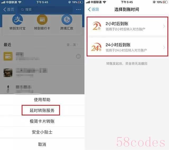 之后底部会弹出更多选项菜单,点击进入「延时转账服务」,之后可以选择延时时间,提供2个小时后到账和24小时到账两个时间可选,大家可以根据需求选择即可。