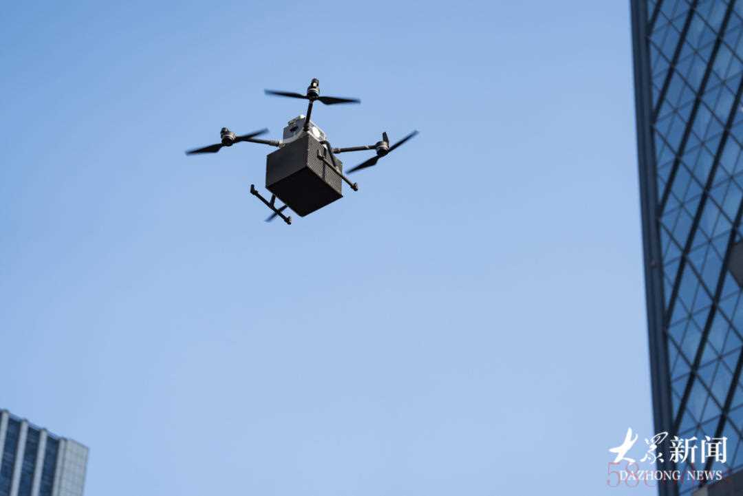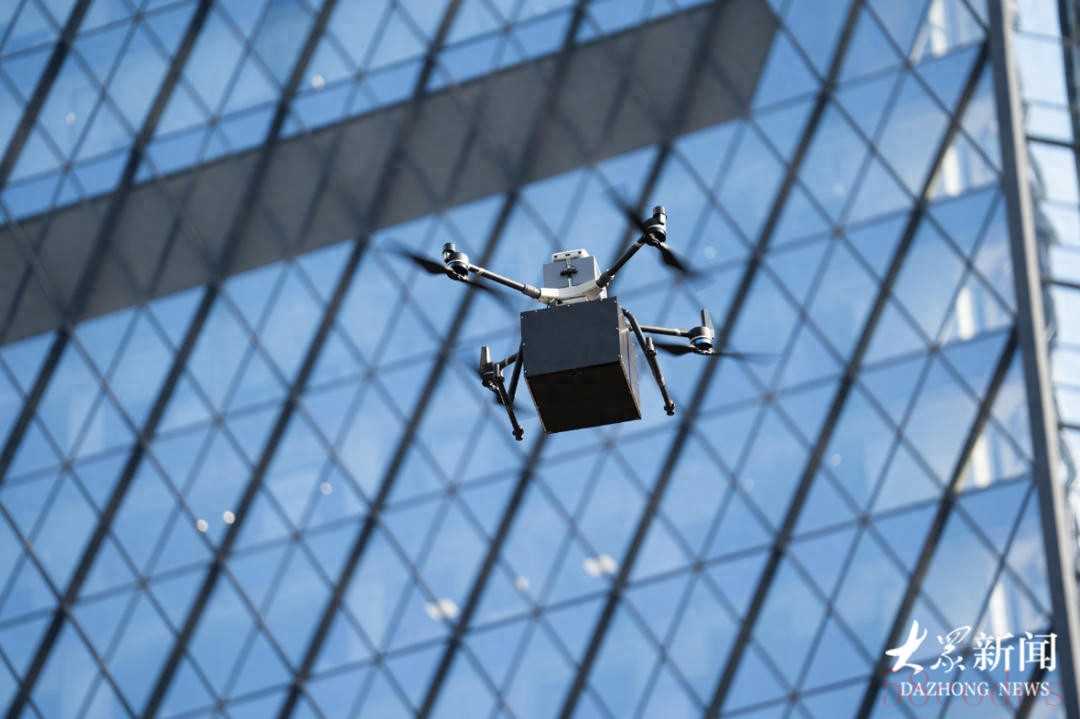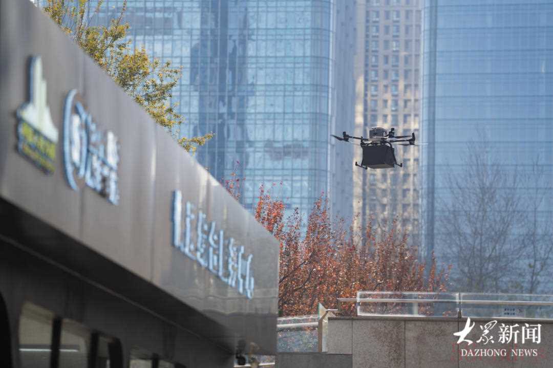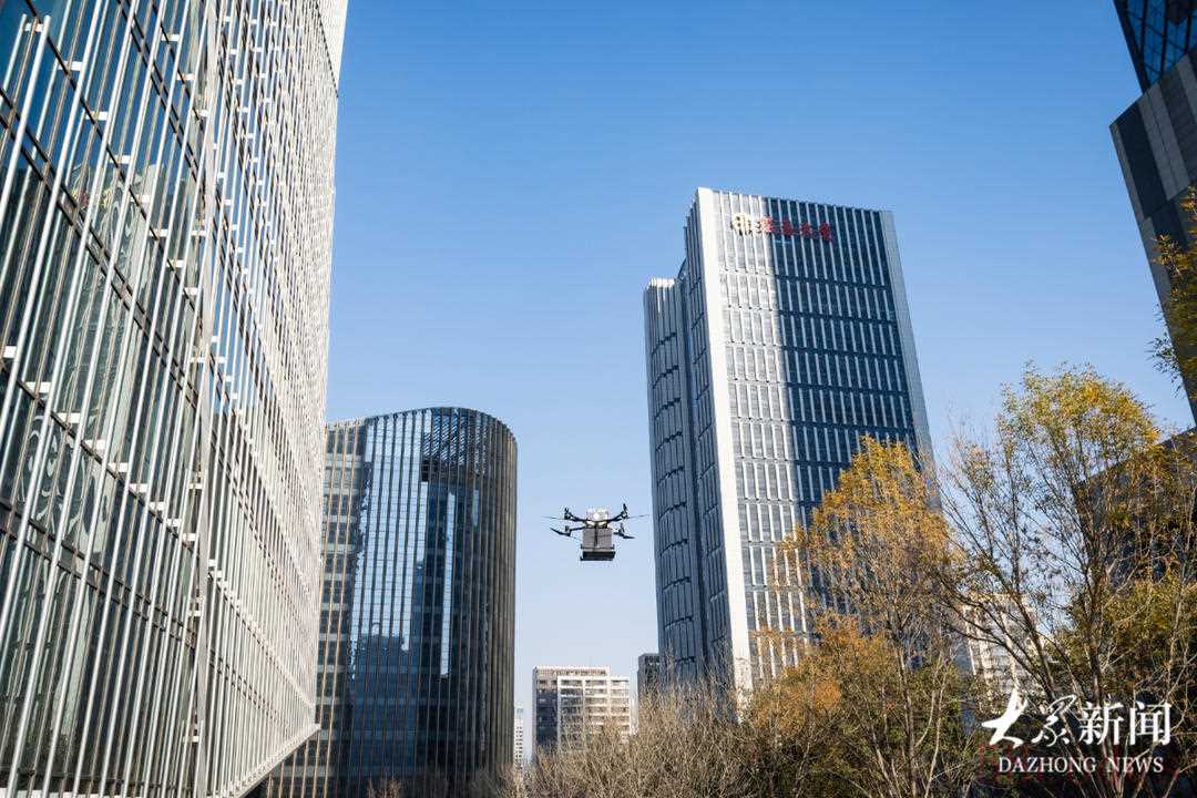 12月5日上午,一架载重10kg级的无人机,在济南中央商务区(CBD)密集的建筑群中起飞。它沿着既定航线,仅用时7分钟就跨越了地面通常需要行驶15分钟的2.2公里路程,稳稳降落在中国人寿大厦南楼的停机坪上。