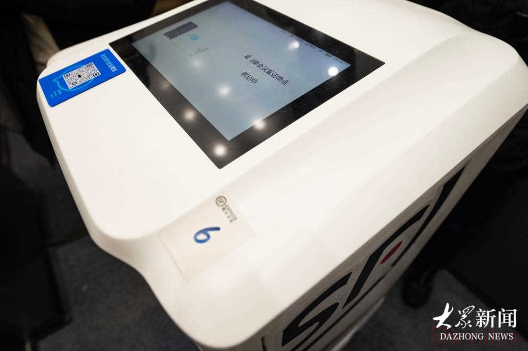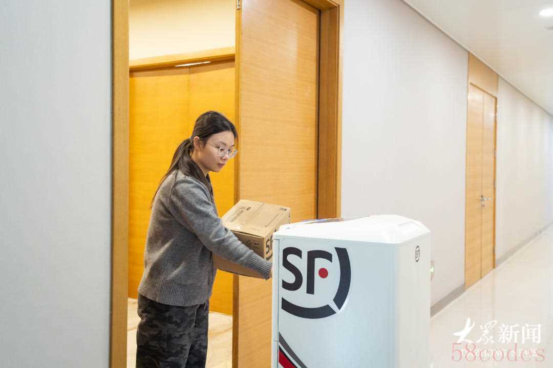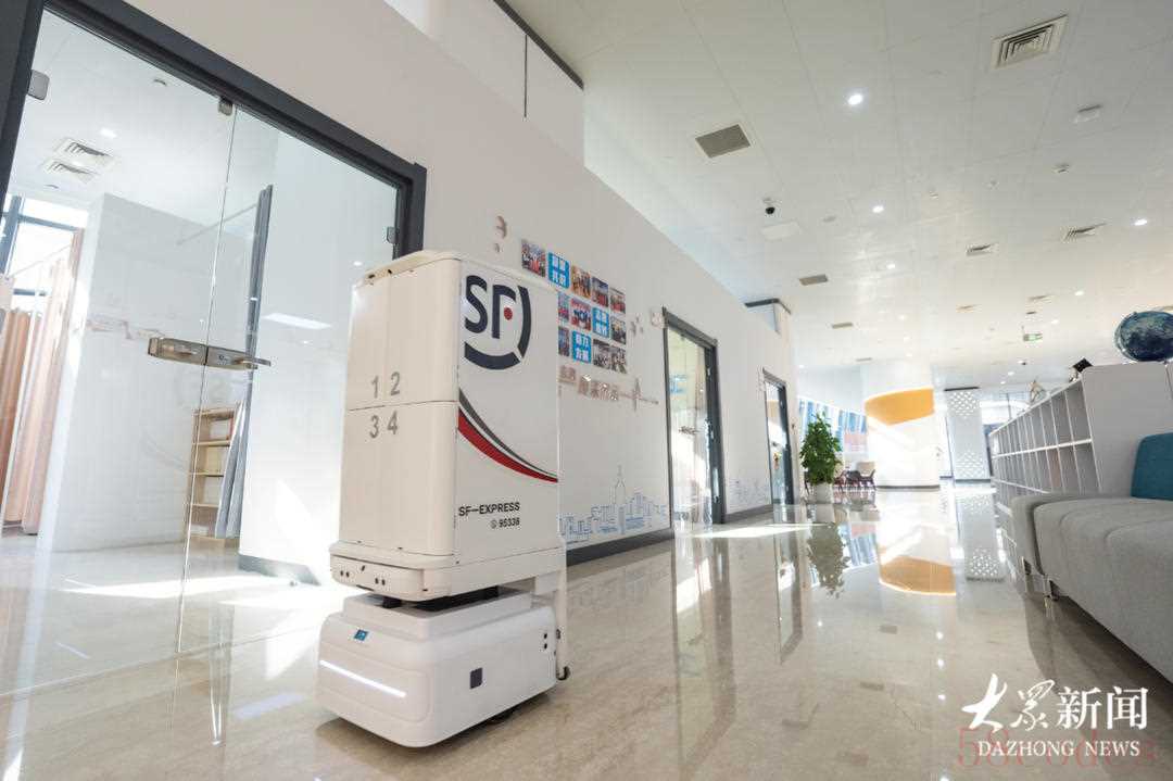 紧接着,一份文件被取出,交由地面的无人车接驳,最后由一台楼宇机器人接手。机器人通过信号联动呼叫电梯,将文件直接送到了收件人的办公室。
