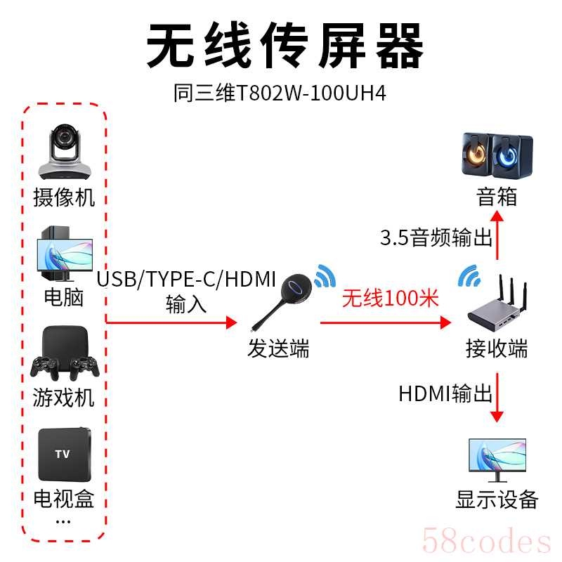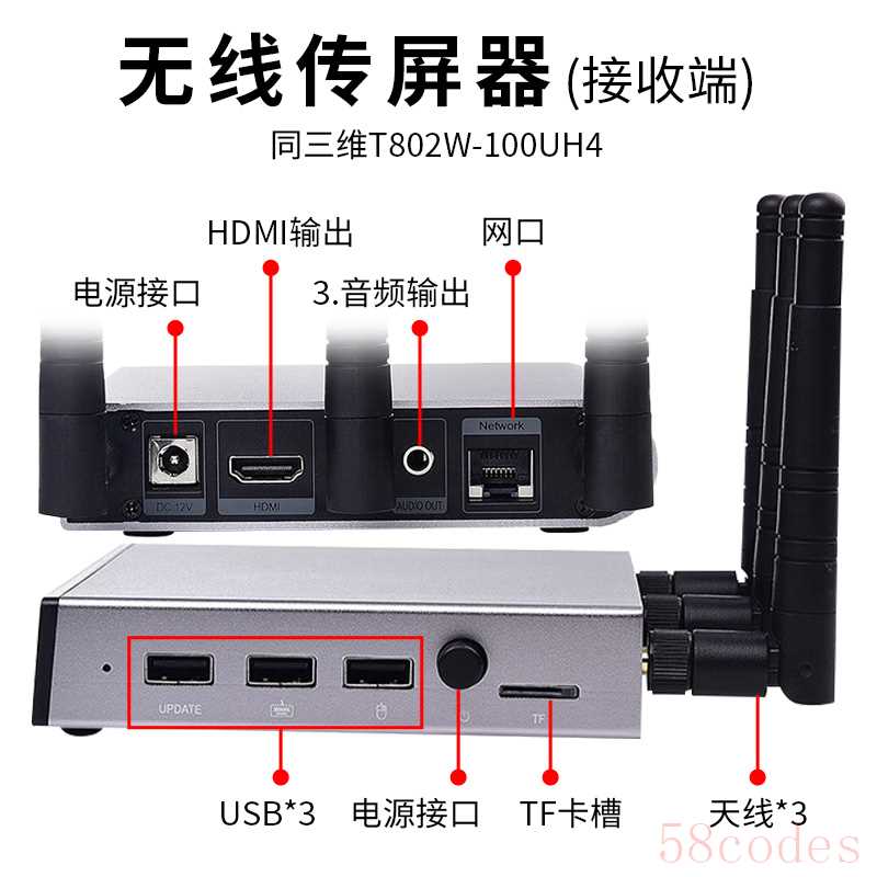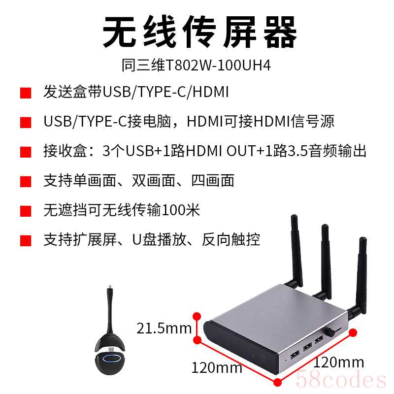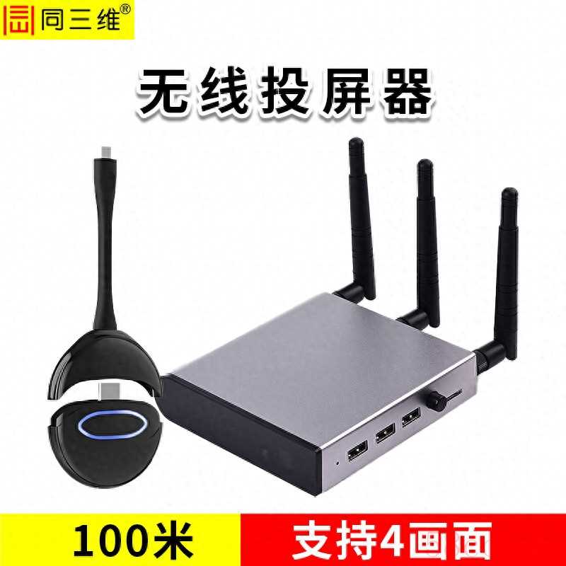 发送盒带USB/TYPE-C/HDMI,USB/TYPE-C接电脑,HDMI可接HDMI信号源,接收盒带3个USB口, 1路HDMI OUT +1路3.5音频输出,1个SD卡槽,1个接收端可支持单画面、双画面、四画面,无线传输100米