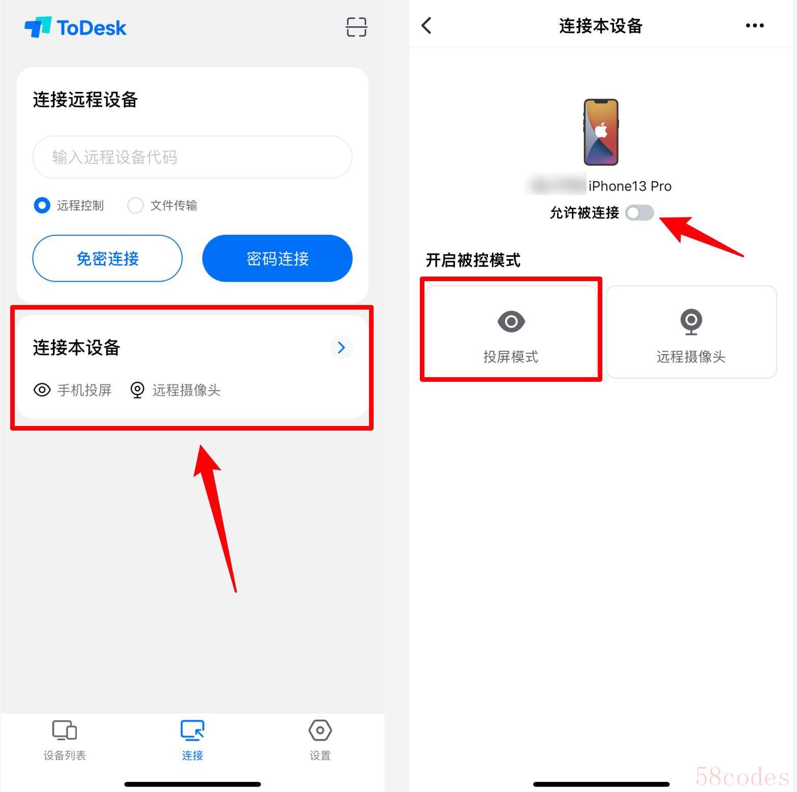 完成账号注册登录后,当需要进行投屏设置时,我们在【连接】界面,点击连接本设备,勾选打开允许远程本设备,然后点击投屏模式。