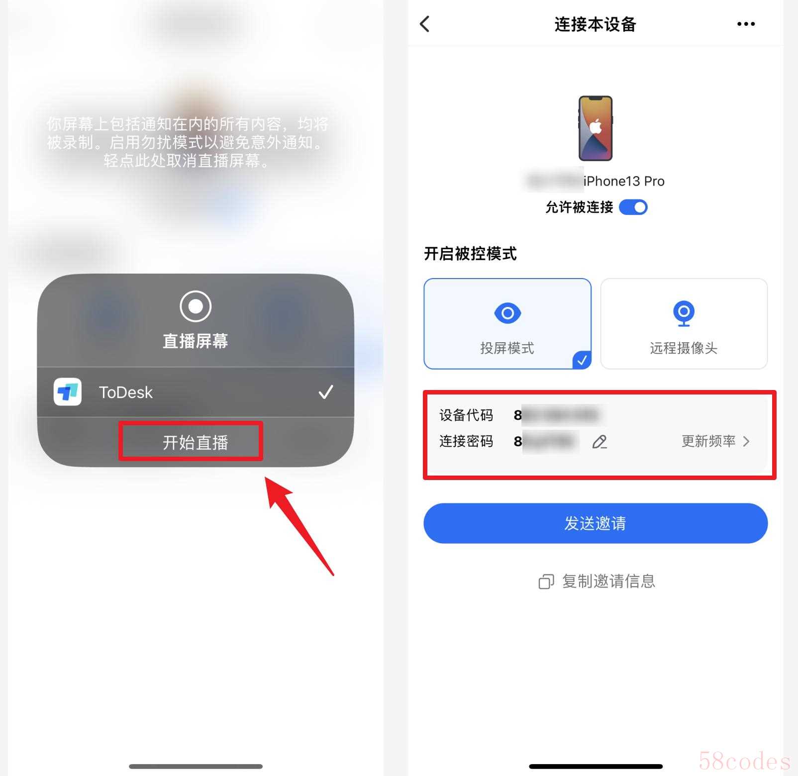 进到后续界面时,出于安全保护考量,我们需要先确认开始直播,这意味着授权开启了录屏权限;待投屏功能开启成功,再通过我们专属的设备代码和连接密码就可以将iOS设备投屏到其他设备了。