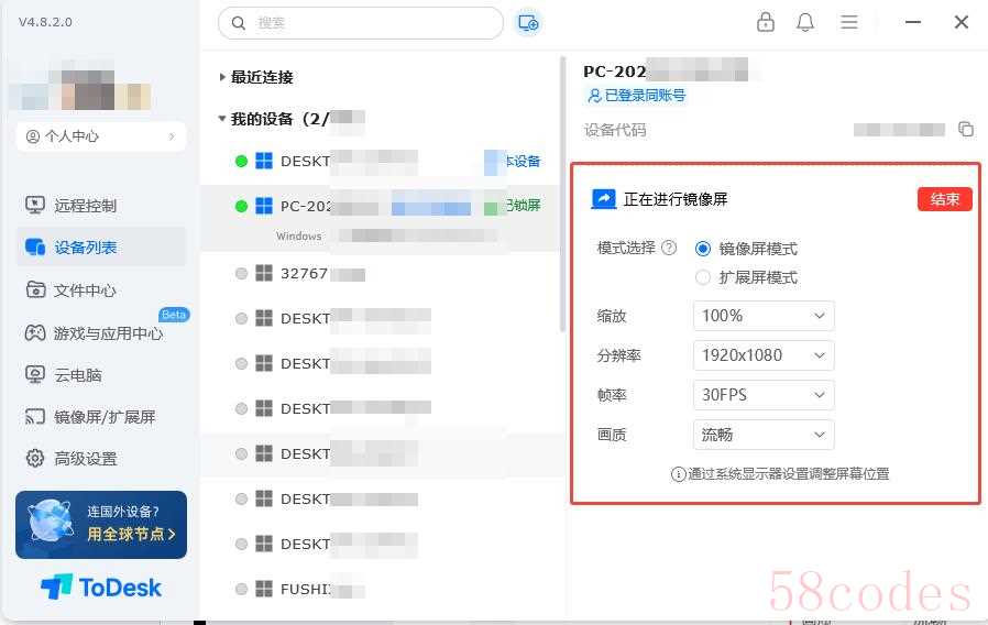 在主控设备列表中,找到此设备,可以调整镜像屏的相关设置,如比例、分辨率、帧率、画质模式等都可根据操作者的习惯及需求灵活调整。
