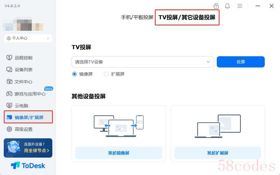在主控菜单栏选择【镜像屏/扩展屏】,点击“TV投屏/其他设备投屏”。