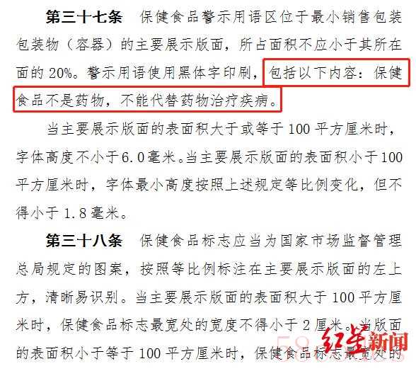 红星新闻注意到,《办法》明确,保健食品警示用语区位于最小销售包装包装物(容器)的主要展示版面,所占面积不应小于其所在面的20%。警示用语使用黑体字印刷,包括以下内容:保健食品不是药物,不能代替药物治疗疾病。