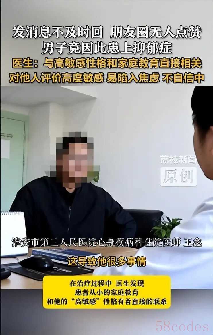江苏淮安一位35岁的男子小张因社交焦虑被确诊为抑郁症。淮安市第三人民医院心身疾病科住院医师王鑫指出,当小张发送消息后未获及时回复时,会感到极度焦虑;若回应或点赞稀少,他便会怀疑他人对他心存不满。