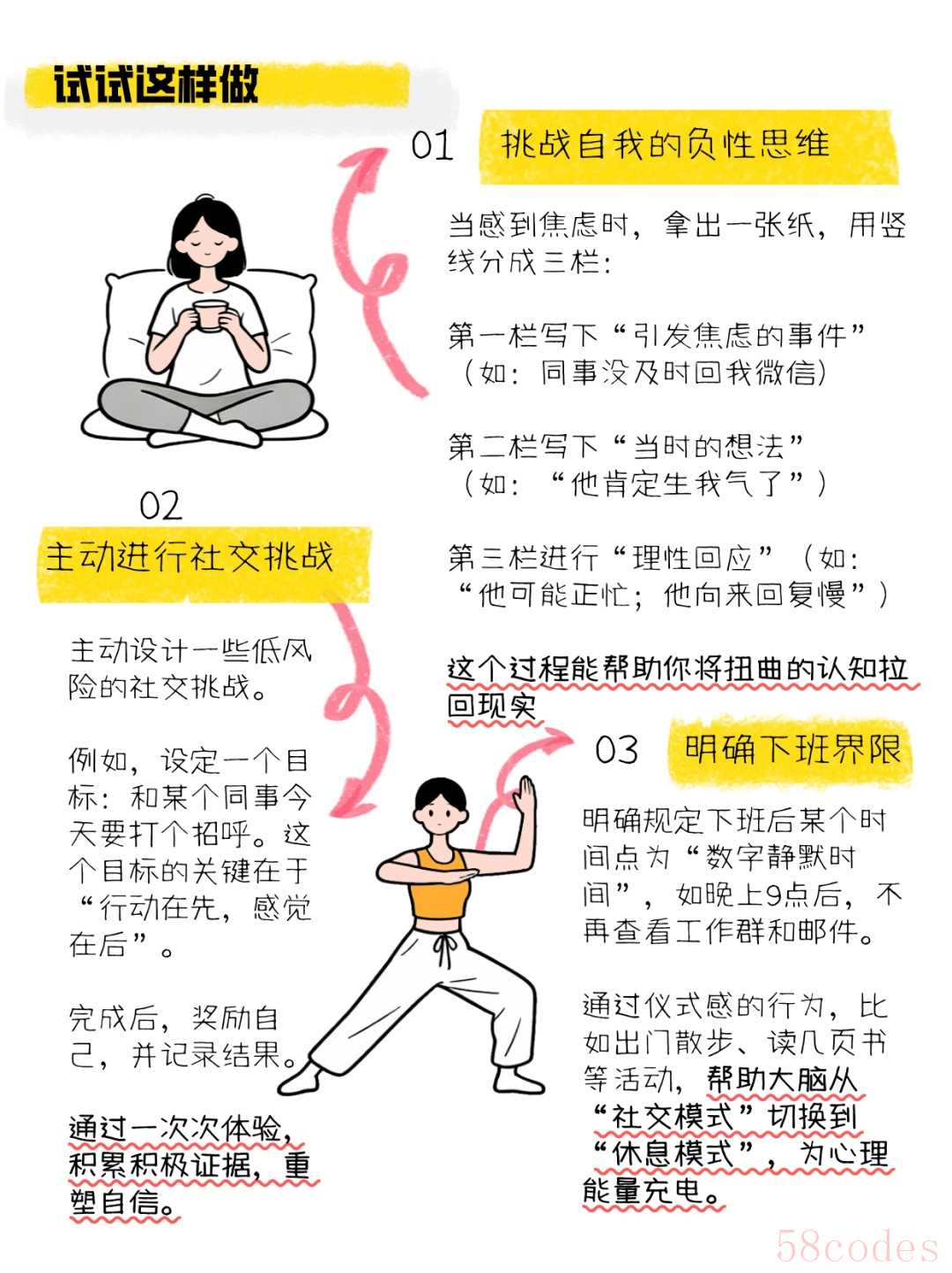 小张“反复回想白天发生的事情”是典型的自我攻击。就像一台无法关机的电脑,持续在后台运行并消耗大量心理资源。个体不断咀嚼、分析过去的社交互动,试图从中寻找自己“出错”或被他人负面评价的证据。这种自我攻击模式不仅无法解决问题,反而会加剧焦虑和自我怀疑,形成恶性循环。