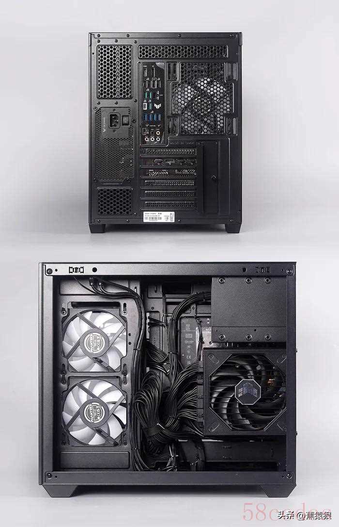 机箱菊花与背部的走线效果展示,双仓式机箱,走线空间非常的富裕。电源选用华硕 TUF GAMING ATX 3.0 850W 金牌全模组,采用 ATX 3.0 设计、具备 10 年的质保时间 、80 PLUS 金牌认证等等..采用黑色压纹包网模组线,质感相当的不错,材质相比普通模组线也来得更软一些,更好的走线,更加的美观,基本可以省去后做定制线的钱了。