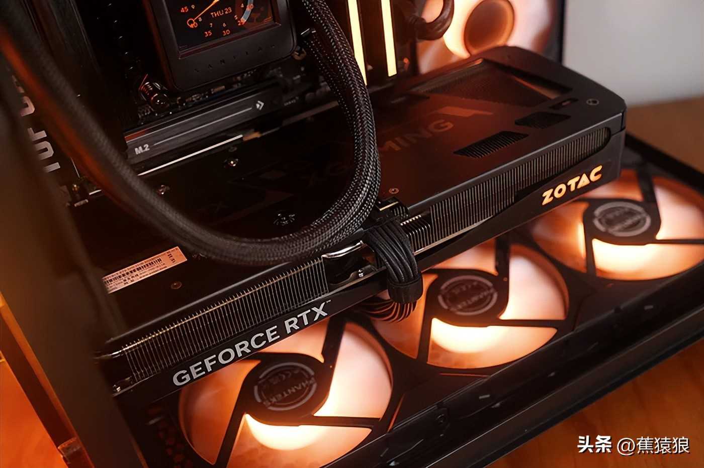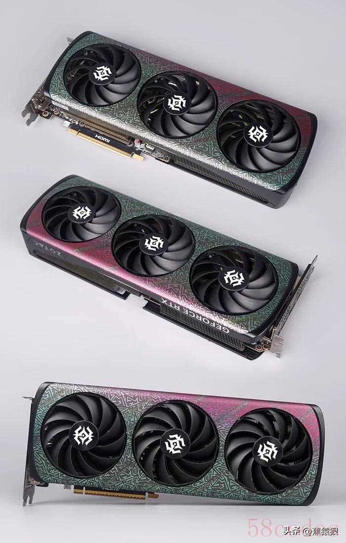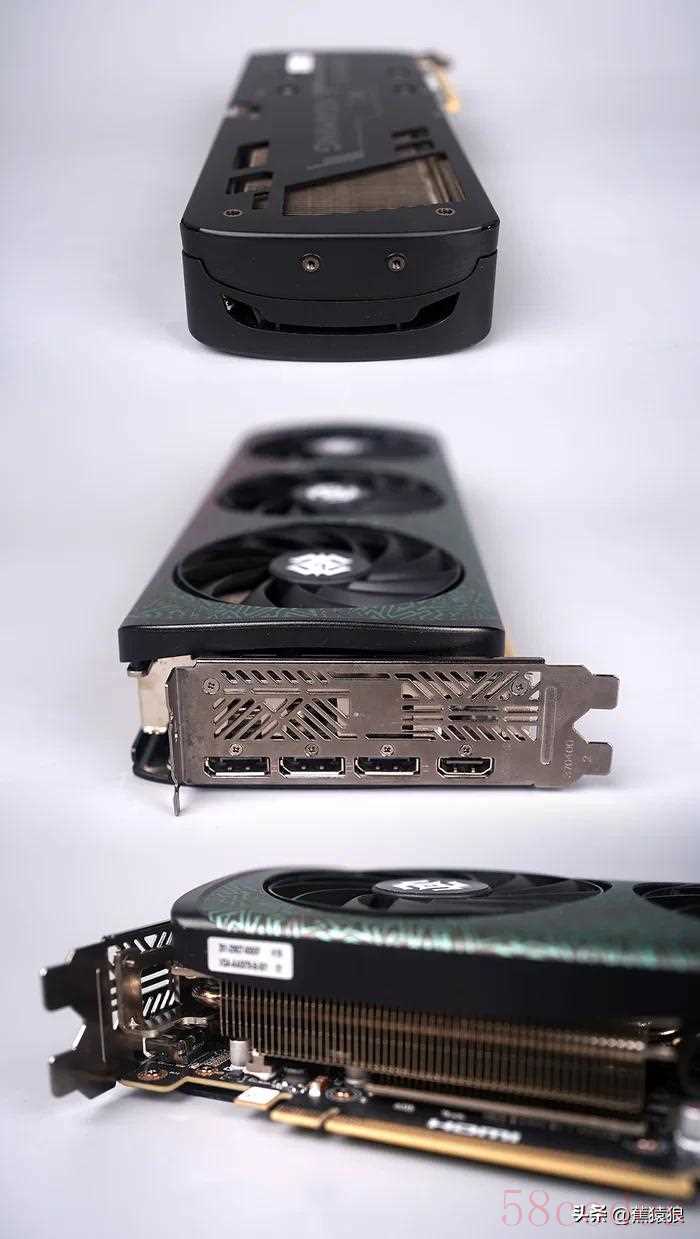 官宣冰芯 2.0 散热系统,采用高效铜底直触设计,纯铜底座可以完整覆盖 GPU 核心,并配备了 5 根 6mm 热管导热。此外,索泰宣称该显卡的散热器会压紧固态电感,该设计可降低显卡啸叫几率。显卡整体厚度约为 2.5 卡槽,输出接口方面,提供了三个 DP2.1 和 1 个 HDMI 2.1 接口。