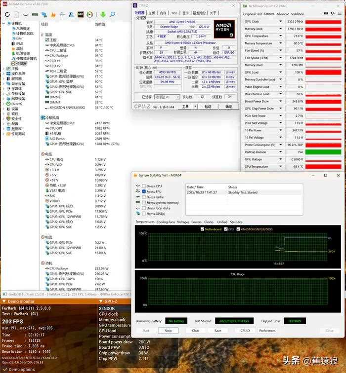 整机双烤测试,20 分钟左右。CPU Package 95 左右,显示功耗 223W 左右,显卡核心温度 71 度,显存 60 度,显示功耗 250W 左右。