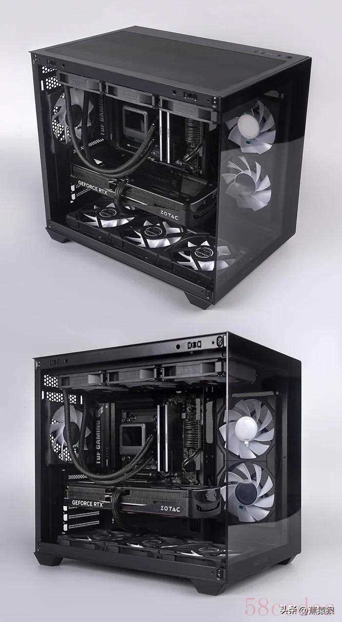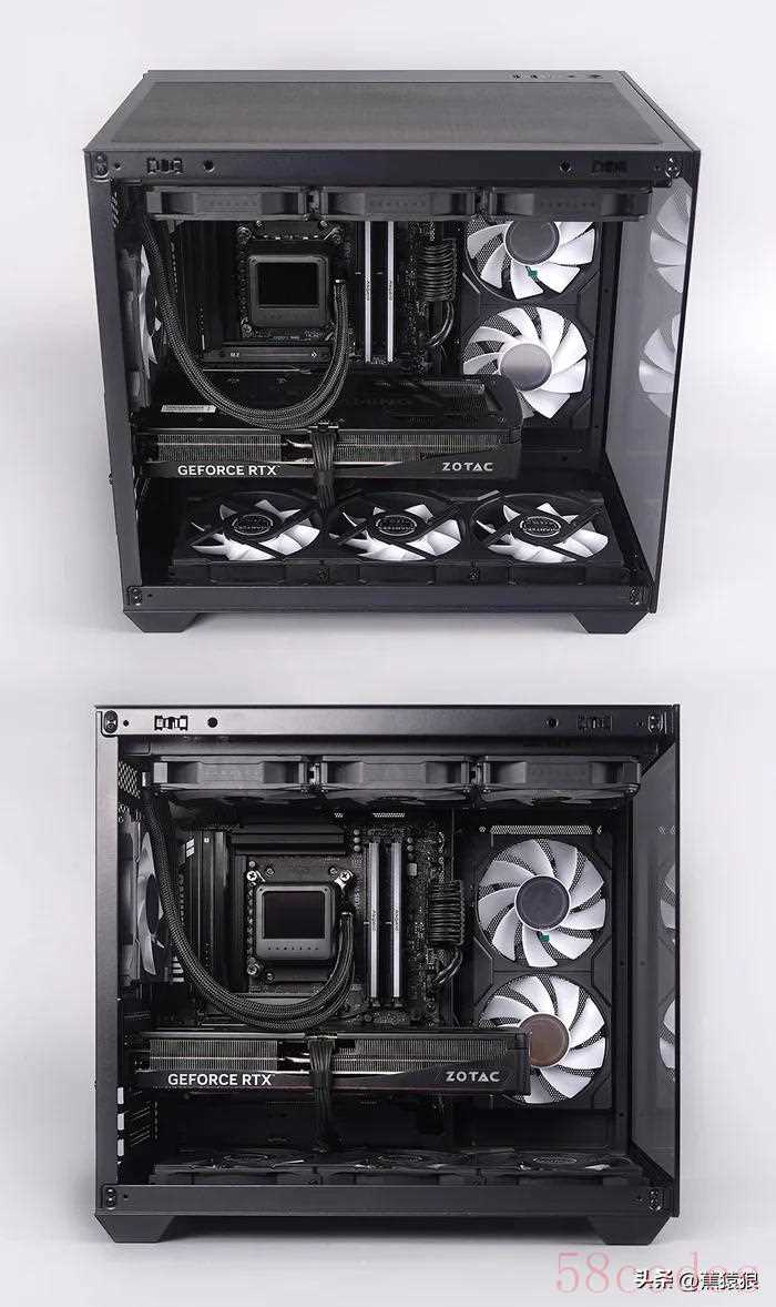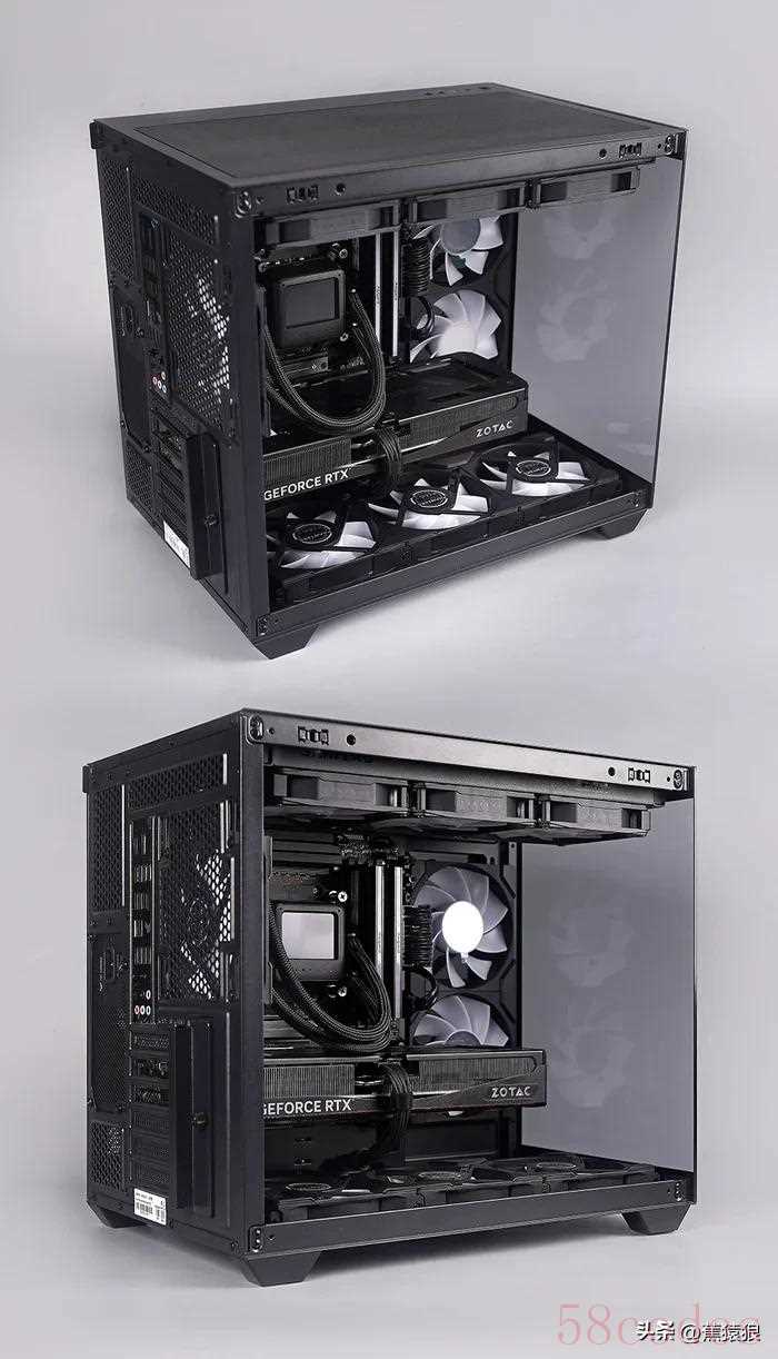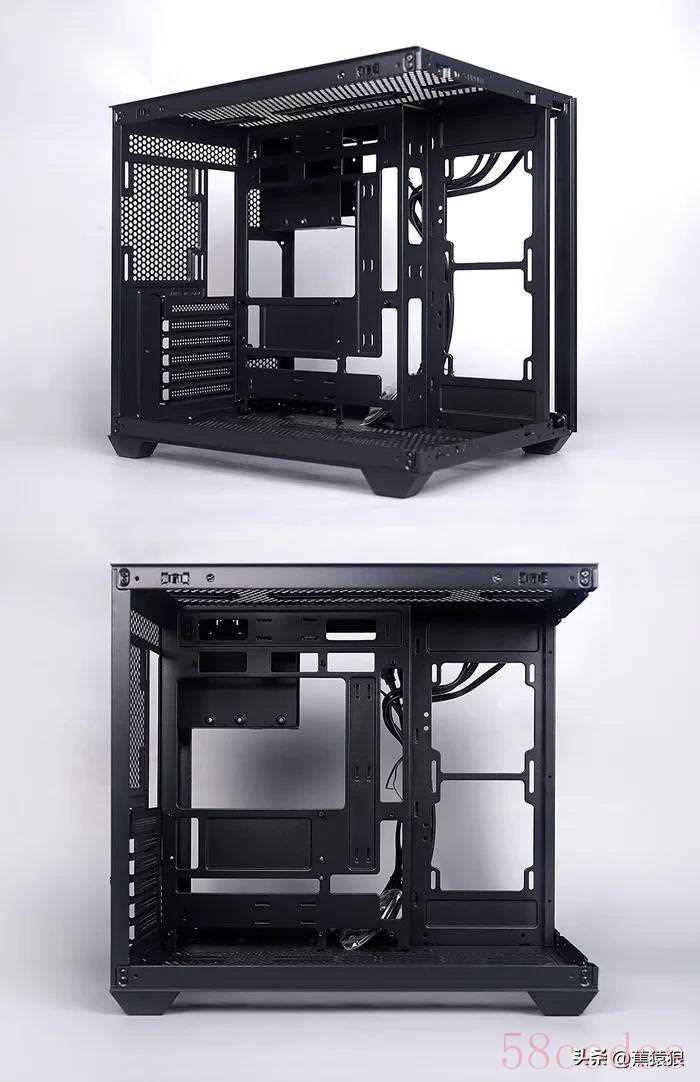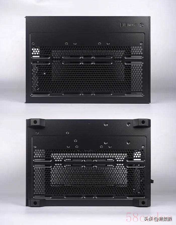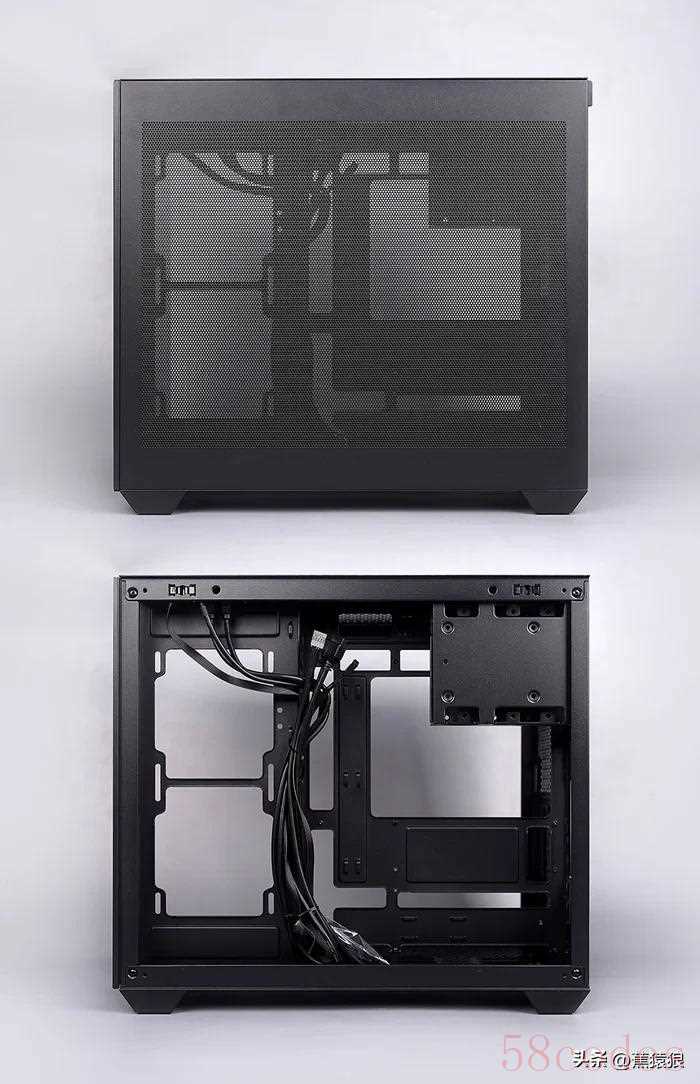 均采用蜂窝状的大散热开孔设计,支持安装 120mm×3/140mm×2 风扇或 240/280/360 冷排。底部四角方形脚垫设计,表面配有橡胶防滑脚垫。