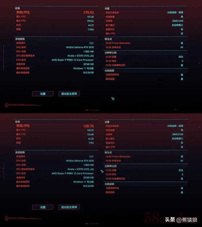 游戏部分:《 赛博朋友 2077 》支持 DLSS4,2K/4K 分辨率,超速特效下开启 4X 帧生成的 DLSS4、选用最新的 TRANSFORMER 模型。测试平均帧数:2K/179.93FPS,4K/120.75FPS,对比 DLSS3 提升确实是非常的大。
