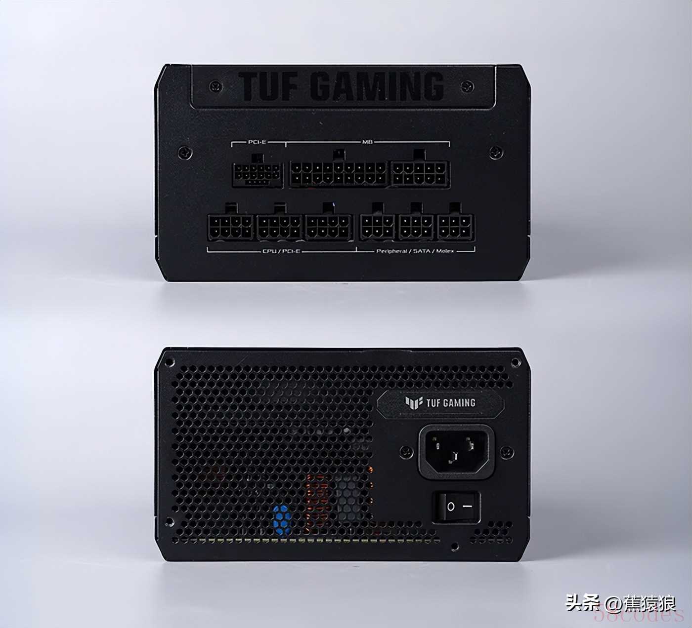 模组接口部分,配有文字示意,给到一个原生 16PIN PCIE 供电接口、常规 PCIE 和 CPU 8PIN 供接口则为通用设计 ( 合计 3 组 )、 3 组 6PIN PERIPHERAL/SATA/MOLEX 供电接口、主板 24PIN 合二为一两组;电源尾部,TUF 铭牌点缀,标准电饭锅三插孔,搭配 AC 开关,一侧大面积开孔出风设计。