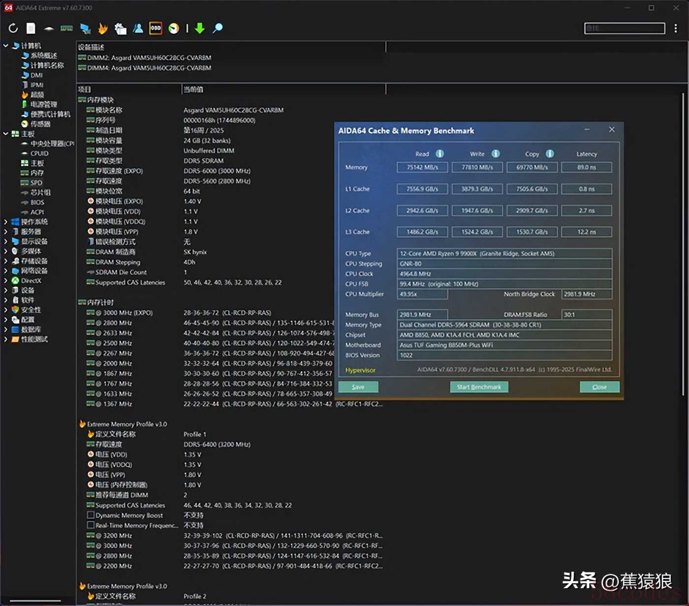 阿斯加特 Asgard 女武神二代白色款 6000Hz C28 24GB×2 套条,AIDA64 Cache & Memory Benchmark 测试。
