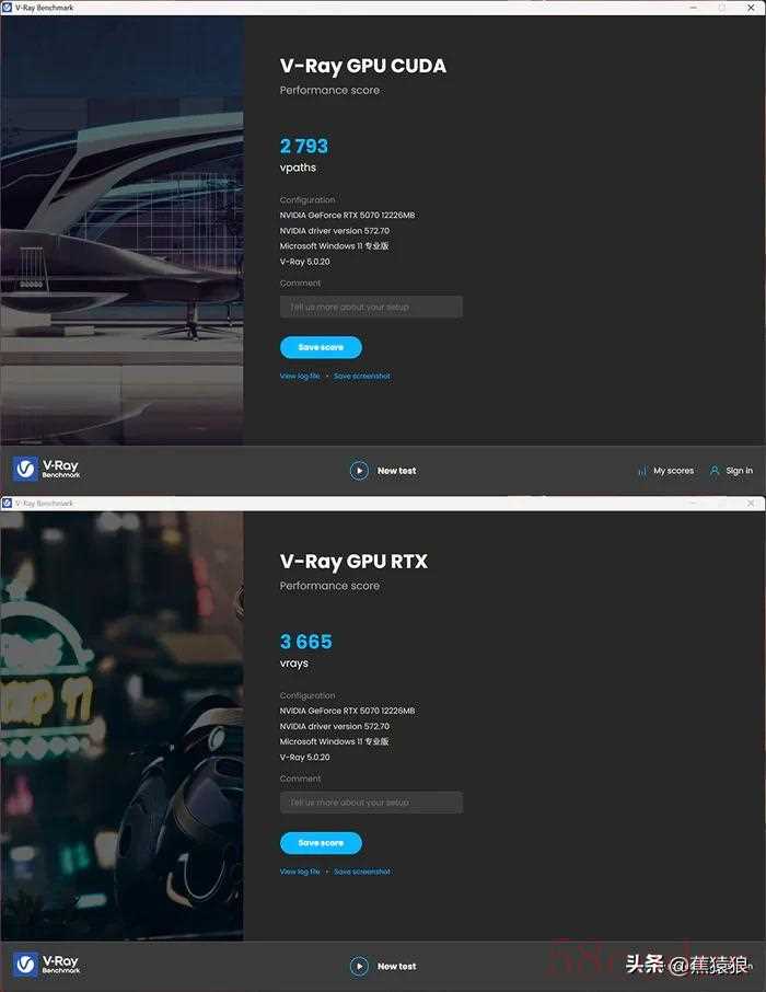 V-Ray测试得分,GPU CUDA 得分 2793,GPU RTX 得分 3665。